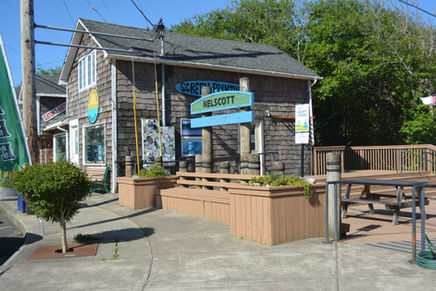 An ADA parking space is located in front of the shops in Nelscott along Highway 101. A paved sidewalk connects the parking area to the storefronts and Scott Plaza. The plaza is a wooden deck that is accessible via a ramp with a gradual grade or a series of wooden steps.